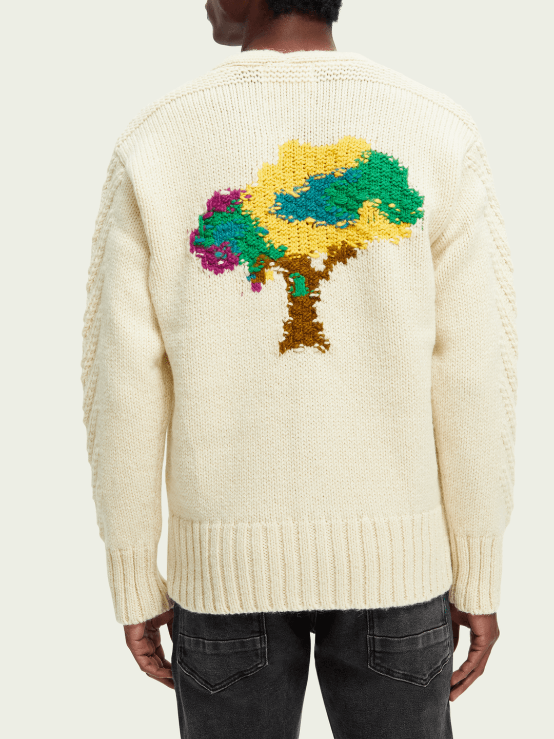 Your cardigan is the result of a collaboration with our friends Knitwit Stable, who are based here, in Netherlands. Knitted from 100% natural, undyed yarns, from 80% White Texelaar sheep and 20% alpaca that graze in the Netherlands, the creation of each cardigan from start to finish is small-scale, uses two kilos of raw wool and takes around one day.